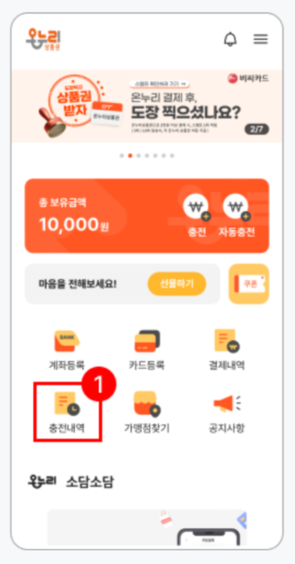 1. 앱의 홈화면에서 "충전내역"을 선택해주세요.