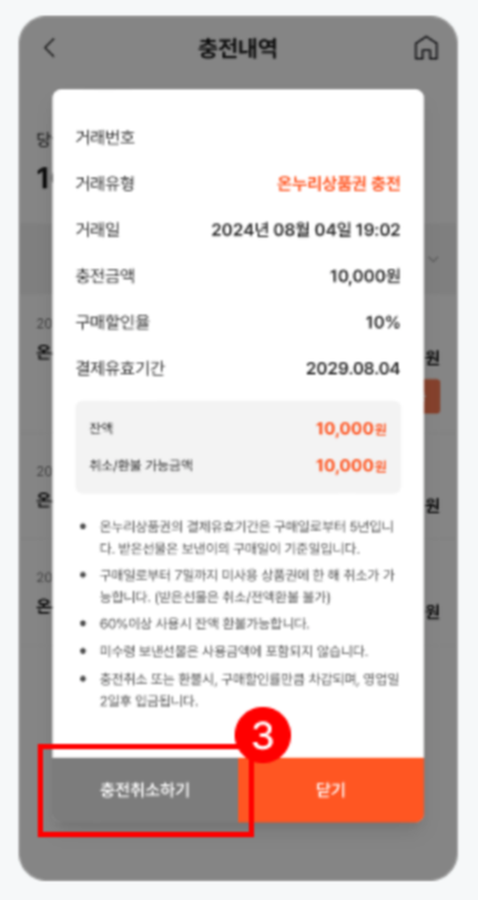 3. 결제 내역 하단에 "충전 취소하기" 버튼을 선택해주세요.