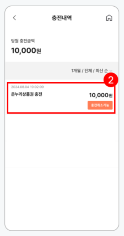 2. 충전 내역 화면에서 "충전 취소가능" 내역을 선택해주세요.