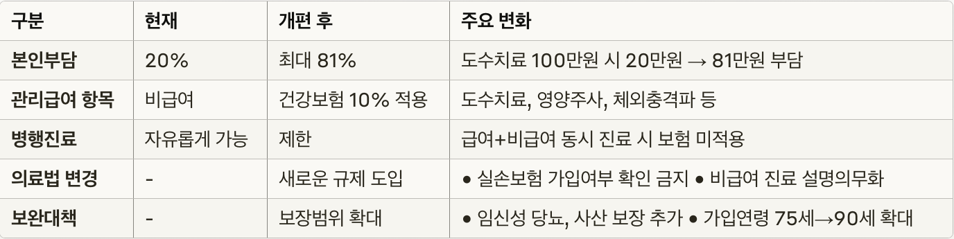 최근 정부가 발표한 비급여 및 실손보험 개편안은 중증 질환 보장 확대와 비중증 치료 항목의 본인 부담률 인상을 핵심으로 하고 있습니다. 이번 개편안은 국민건강보험과 실손보험의 재정 건